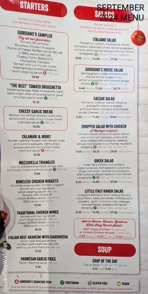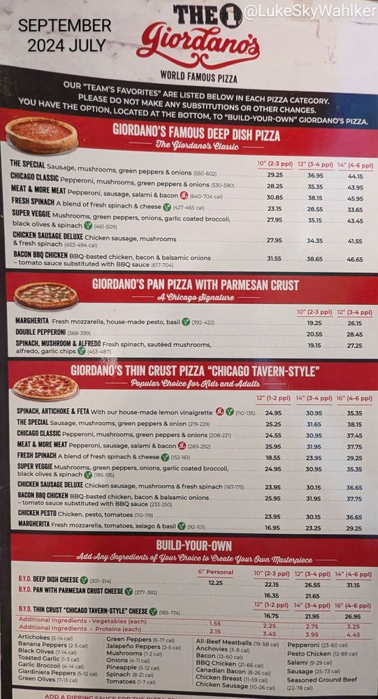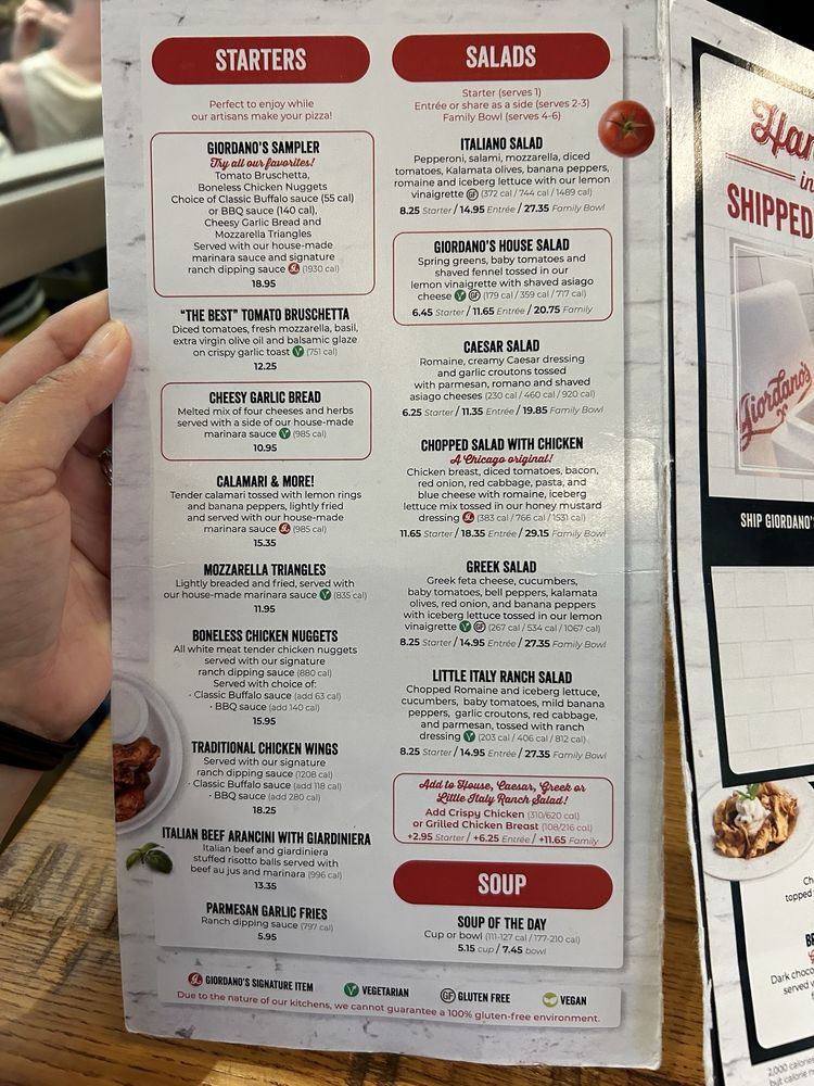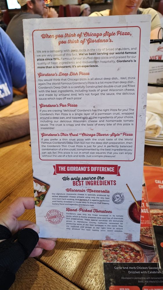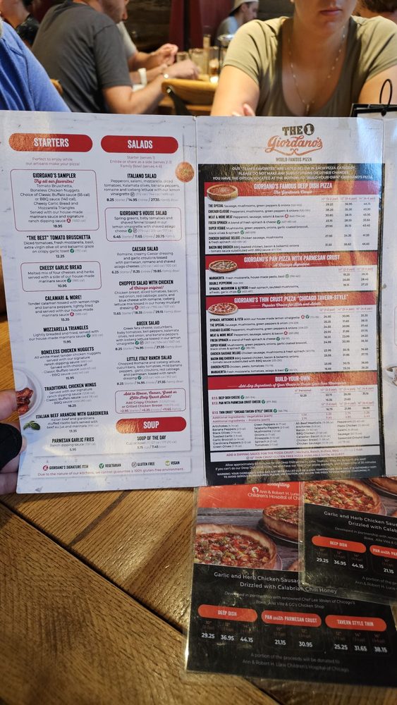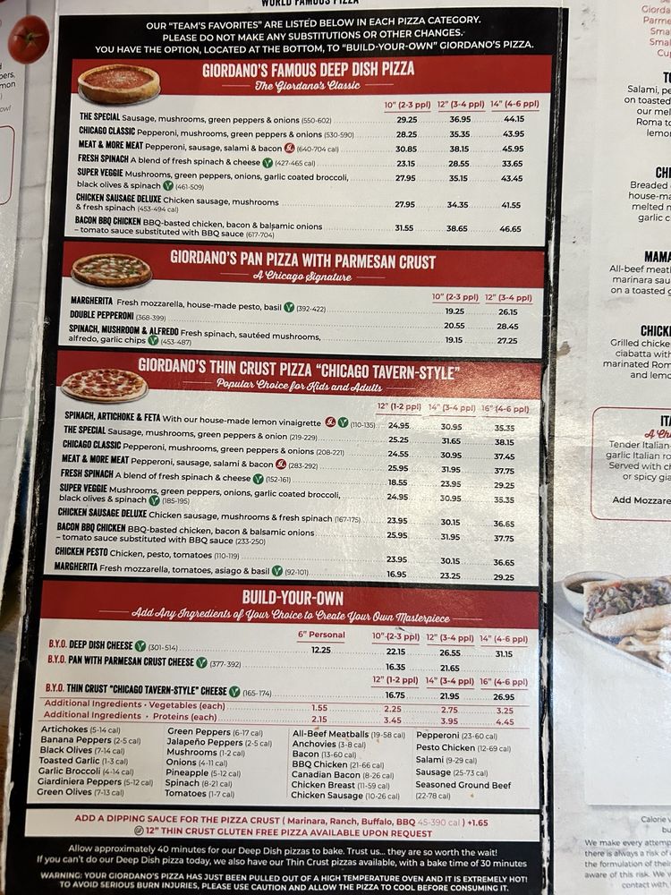 Giordano's, located in Chicago, is a must-visit for deep-dish pizza lovers. The menu offers a variety of options, including classic Chicago deep-dish pizza loaded with toppings like sausage, mushrooms, peppers, and onions, as well as mouth-watering salads and starters like boneless chicken bites and calamari. Customers rave about the thin, light crust and flavorful sauce of the deep-dish pizza, which easily serves hungry diners. The cozy atmosphere and courteous staff add to the overall dining experience. Whether you're a local or a tourist, Giordano's is worth a visit for a taste of authentic Italian cuisine in the heart of the Windy City.